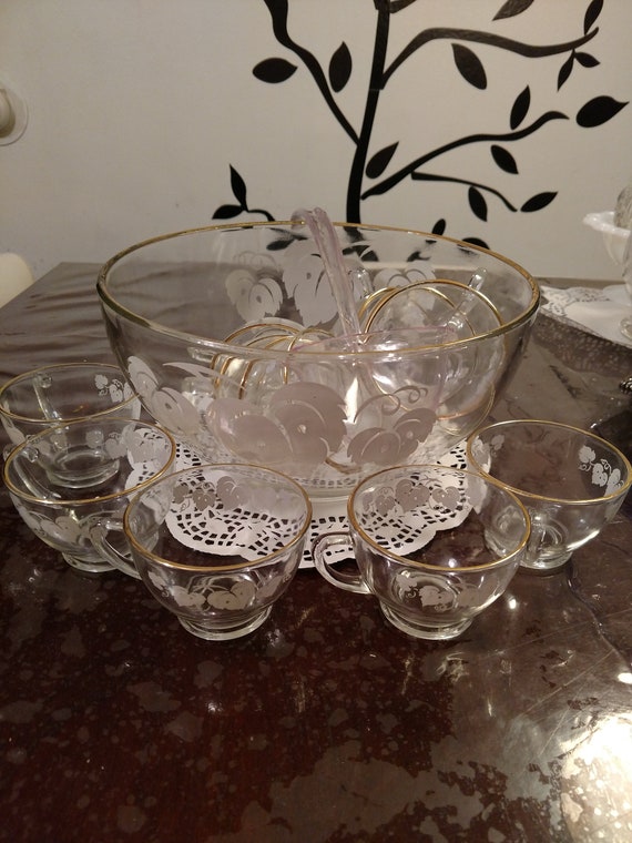 Vintage anchor hocking wexford bowl iridized tinted color, green luster w/ painted gold. Vintage anchor hocking punch bowl 11 cups arlington diamond cut fan ladle. Vintage anchor hocking pressed glass starburst daisy punch bowl cups set of 12. Set of eight vintage dorothy thorpe silver band roly poly tumblers or punch cups, with punch bowl. It still looks as good as.